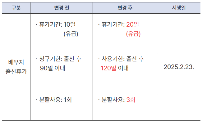 ¹è¿ìÀÚ Ãâ»êÈÞ°¡ÀÇ Áö¿ø ±â°£ÀÌ ±âÁ¸ 5ÀÏ¿¡¼ ¹è¿ìÀÚ Ãâ»êÈÞ°¡ Àüü ±â°£(20ÀÏ)À¸·Î È®´ëµË´Ï´Ù.
