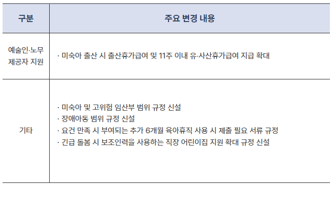 ¶ÇÇÑ, °³Á¤ ¹ý·É°ú ¿¬°èÇÏ¿© ÇöÀç °³Á¤ ´Ü°è¿¡ ÀÖ´Â À°¾ÆÈÞÁ÷ ±Þ¿© Àλó, ³ÀÓÄ¡·áÈÞ°¡ ±Þ¿©, ¹è¿ìÀÚÃâ»êÈÞ°¡ ±Þ¿© Áö¿ø ±â°£ È®´ë µîÀÇ °³Á¤¾Èµµ ÇÔ²² ½ÃÇàµÉ °ÍÀ¸·Î ¿¹»óµË´Ï´Ù.